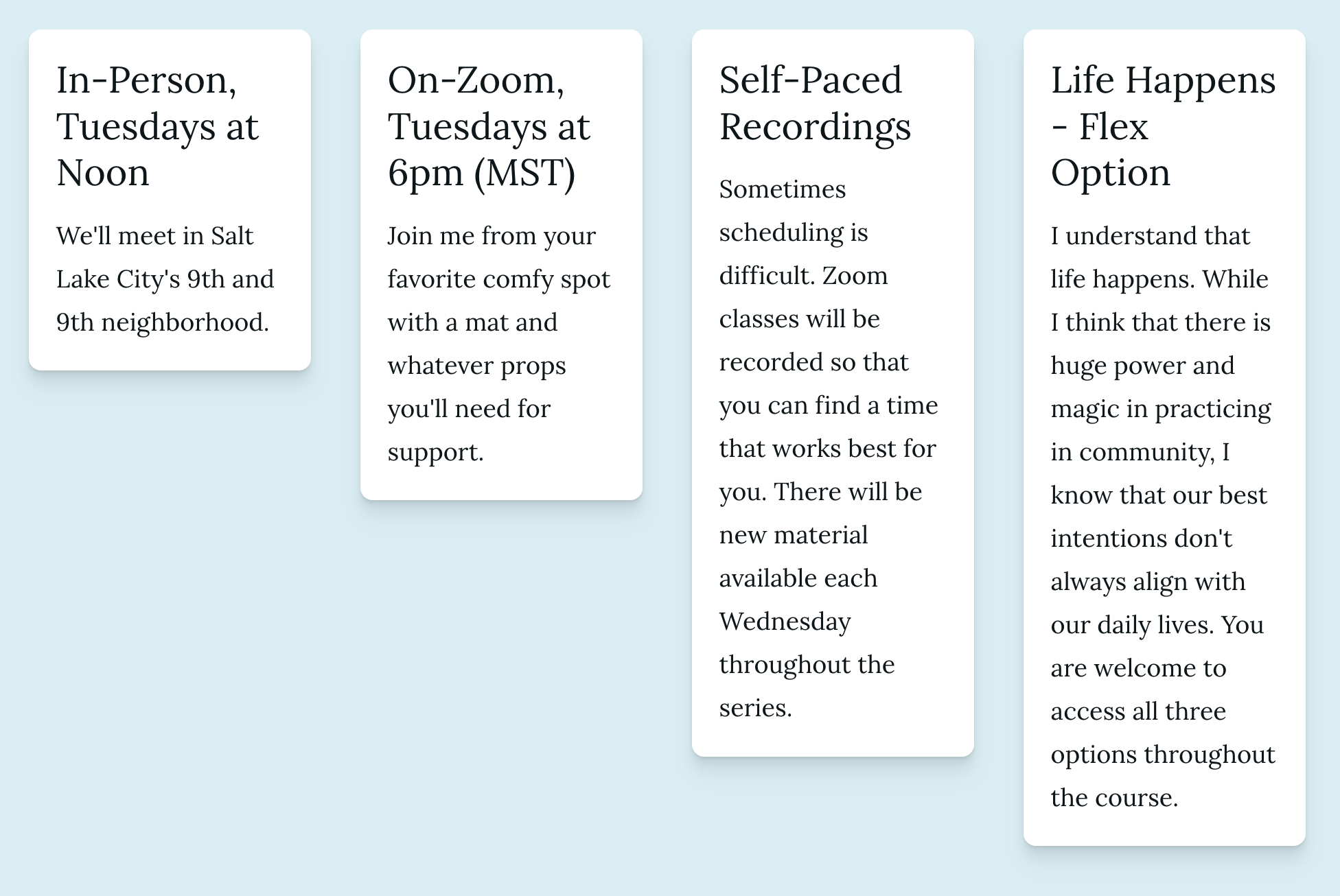I'll be offering this class in-person in Salt Lake City, on Zoom and via self-paced recordings. You may choose one or mix and match depending on your weekly schedule! Each class is 75-90 minutes.